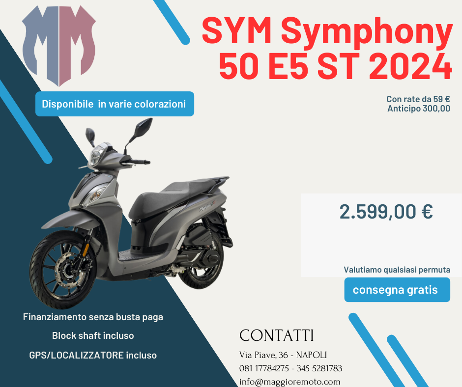 Con un design completamente nuovo, Symphony 50 Euro 5, grazie al suo peso contenuto, è particolarmente adatto a chi si cimenta per la prima volta alla guida di uno scooter. La pedana piatta, l’ampio vano sottosella ed il bauletto in tinta, a corredo del veicolo, aggiungono comfort e capacità, sia in città, sia per una gita fuori porta.